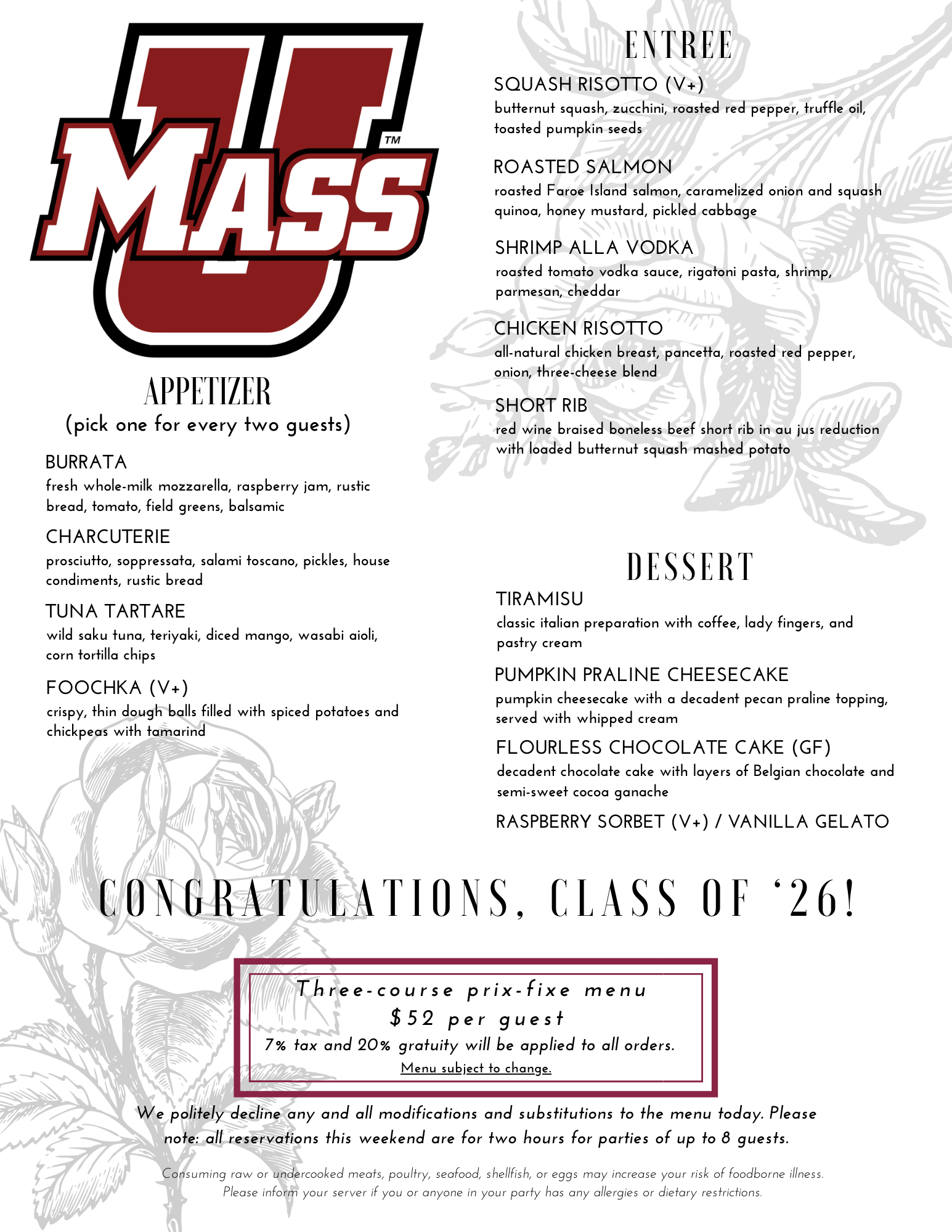 For UMass graduation weekend, we will be serving from a specialty three course prix-fixe menu for $52 per guest. All reservations require a $10 per guest deposit. Keep scrolling to check out the menu, and reach out to us directly with any questions or to let us know about any allergies/dietary restrictions. This menu is subject to change.