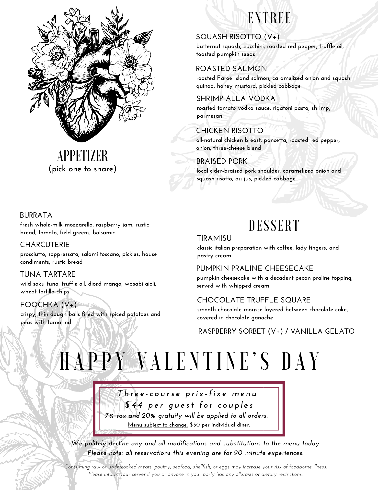 For Valentine’s Day this year, we’re offering a fabulous three-course prix-fixe menu for $44 per person, available for viewing below. There is a 90 min limit per reservation on this day.