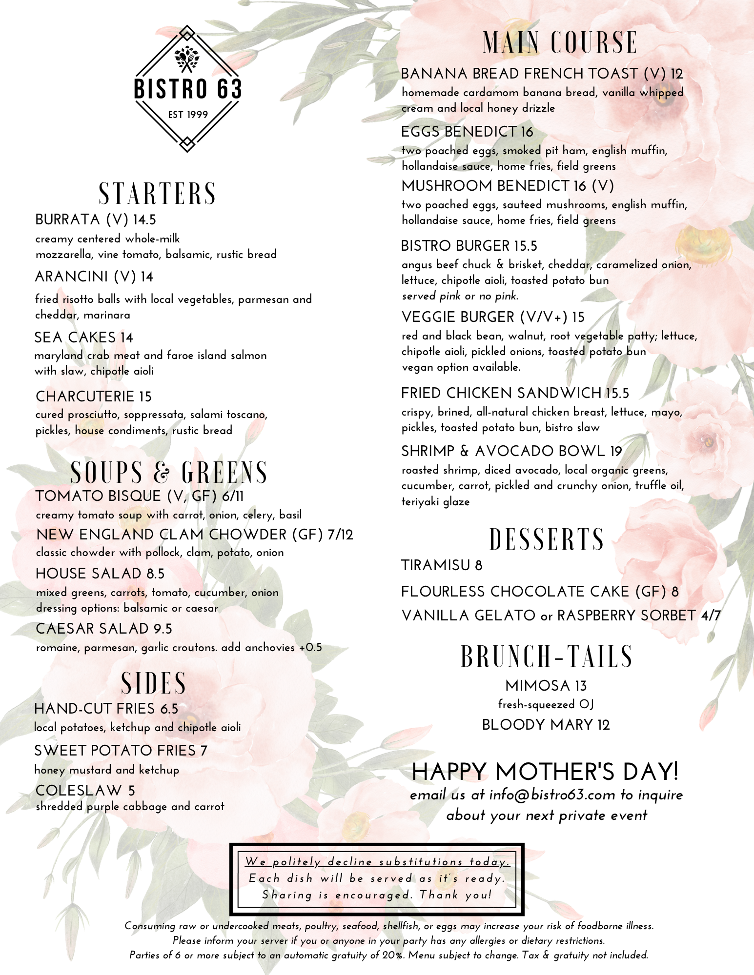 We’ll be serving from a specialty menu combining crowd favorites with delectable brunch items just for this special day. When making your reservation, please let us know if you or anyone in your party has any dietary restrictions or allergies.